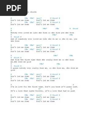 E uhC G D Don't let me C down 望む事 D を止めた E ら G ah ねぇ C 楽にな D れるのかしら E C G D E C G D E C G D E C G D E uhC G D E C G D E C G D E C G D E uhC G D E C G D つまり E 愛憎も C 見下す G 毛嫌い D も、嫉妬。 E uhC G D Don't let me down 「阿部真央」の楽曲一覧はこちらChorus E F#m B E F#m Don't let me down Don't let me down Don't let me down B E Don't let me down E F#m B E Nobody ever loved me like she does Oo she does yes she does E F#m And if somebody ever loved me like she do me B E Oo she do me, yes she does **Chorus E B I'm in love for the first time Don't you know it's gonna lastDon't let me Fm down こんな日 Cm は Don't let me Fm down そばにい Cm て ひとFm り (一人)じゃとても眠 Cm れないから ベッFm ドでいつも歌 Cm ってくれた